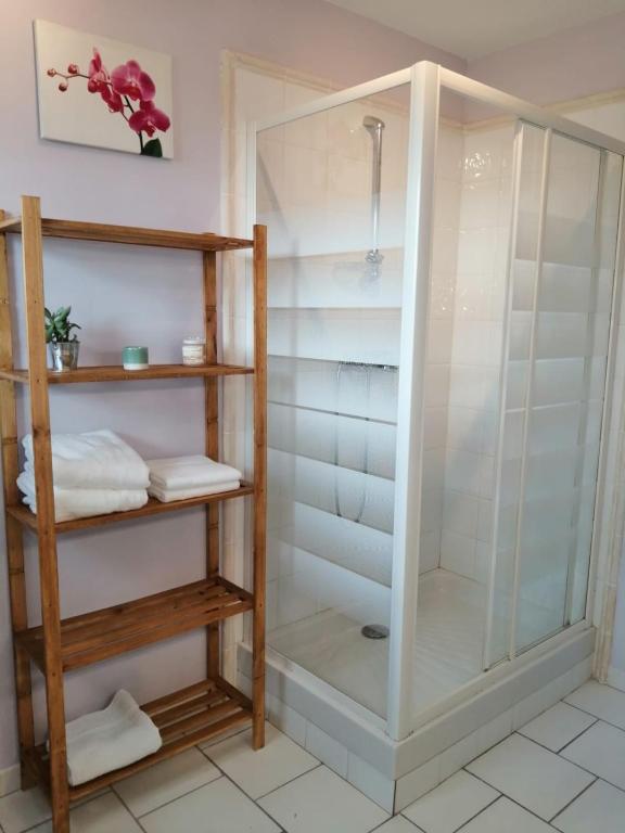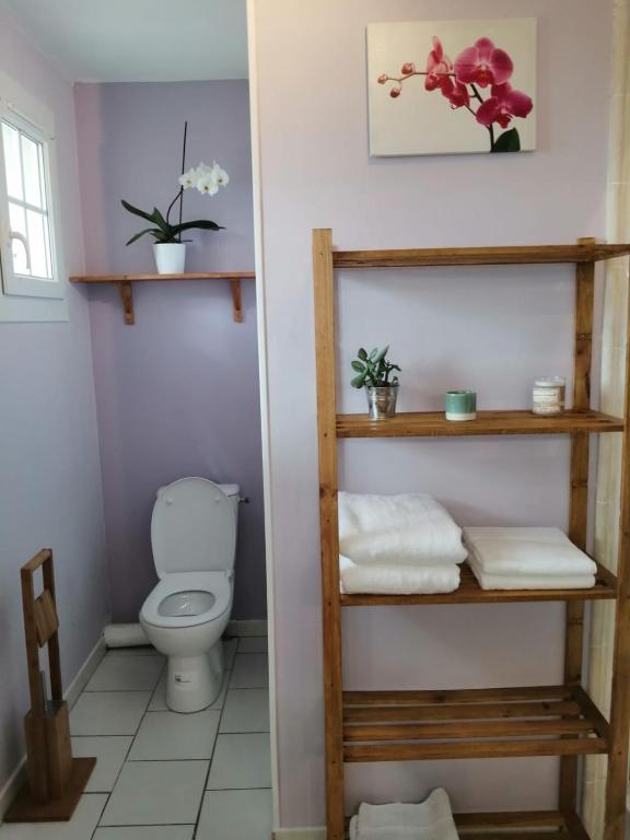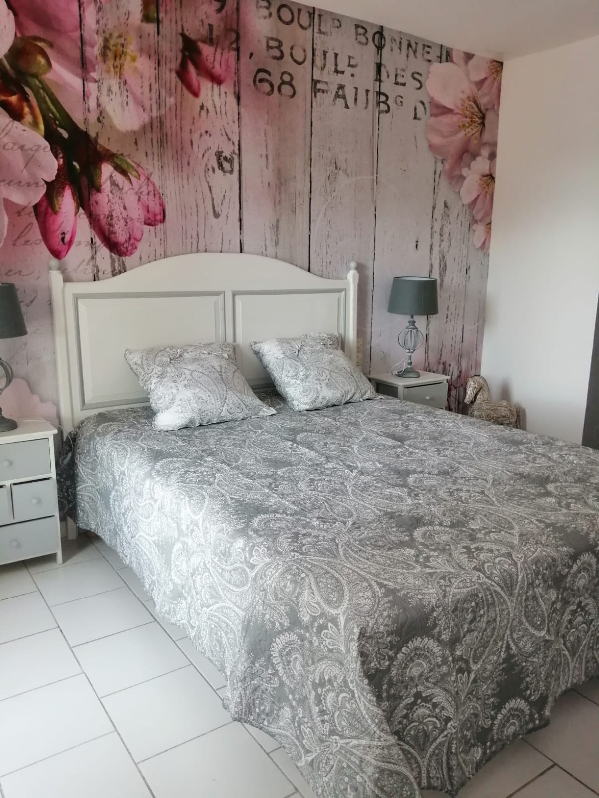 La chambre 1 a été entièrement décorée de gris et de rose, et dispose d’une entrée privative donnant sur la terrasse et la piscine.