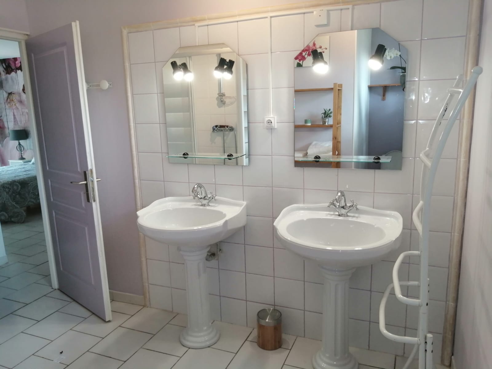 C’est une grande chambre capable d’accueillir jusqu’à 4 personnes, dotée d’une salle de bain avec douche, deux lavabos et toilettes.