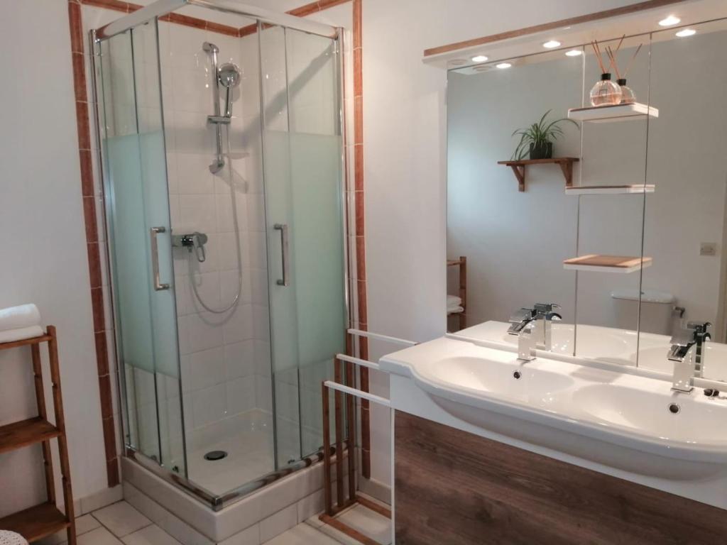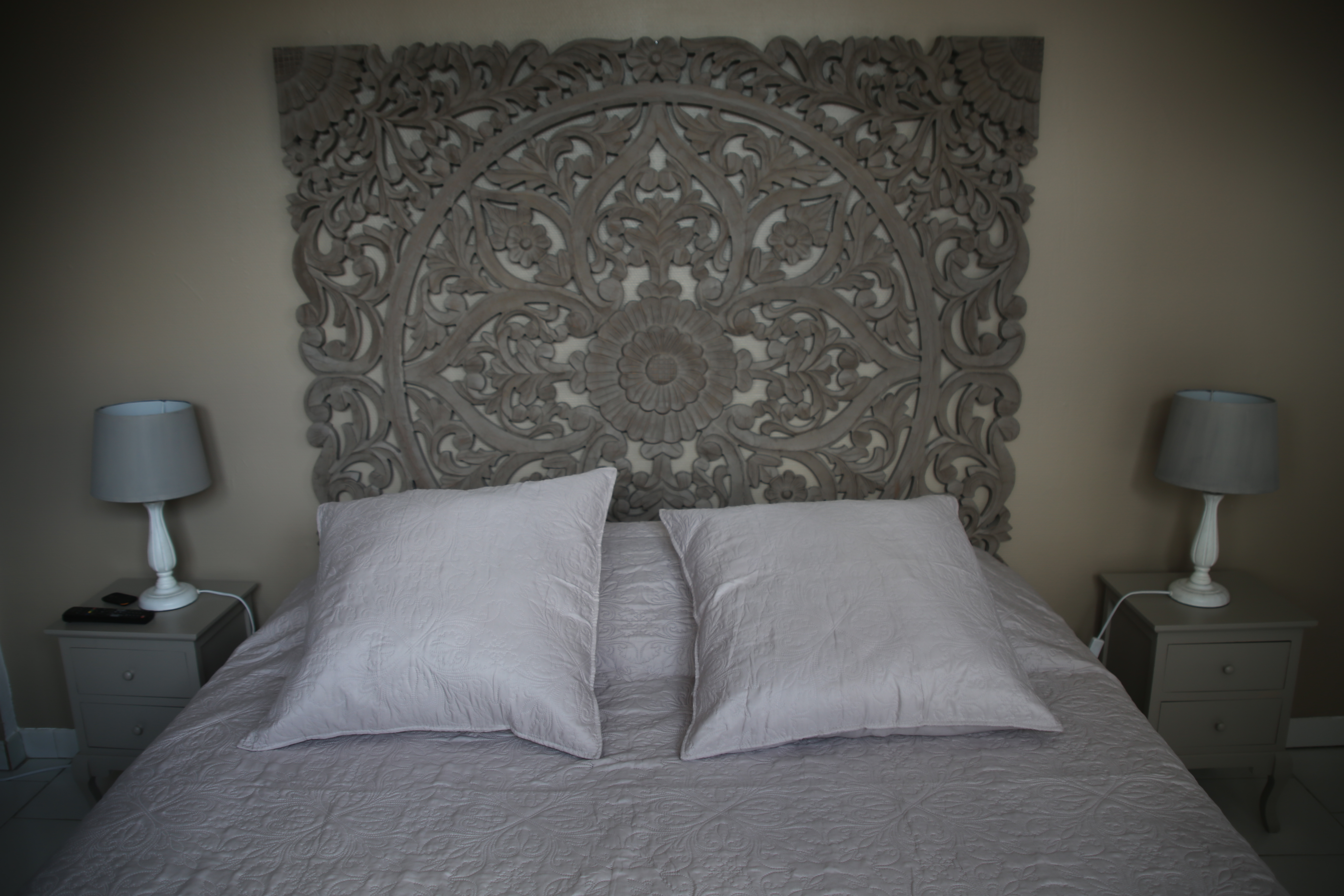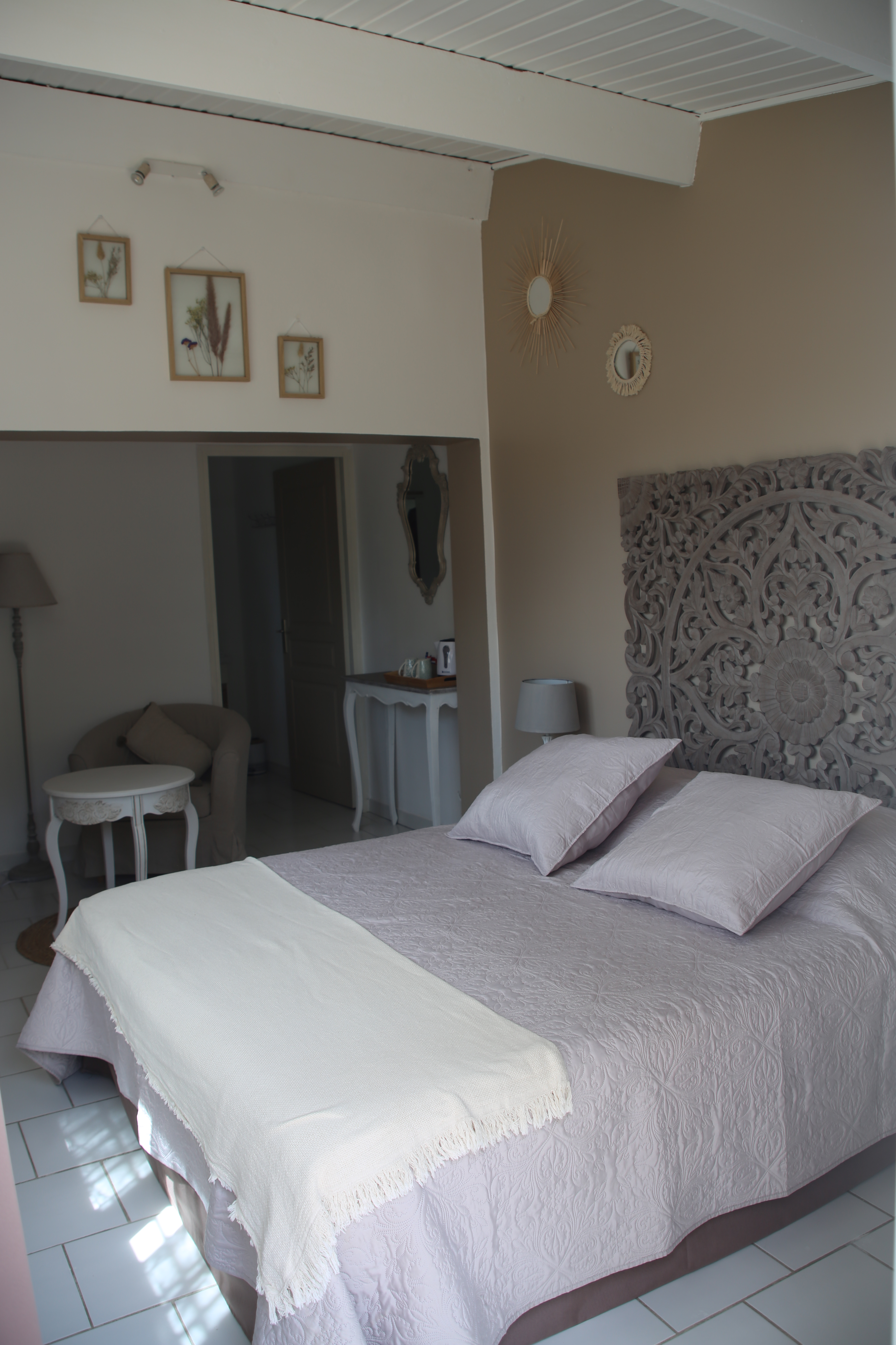 La chambre 4 est une chambre un peu à part. Son entrée, située sur une façade différente des autres chambres, donne sur le bois et les écuries. Elle est décorée de beige et taupe ce qui lui confère une ambiance apaisante.