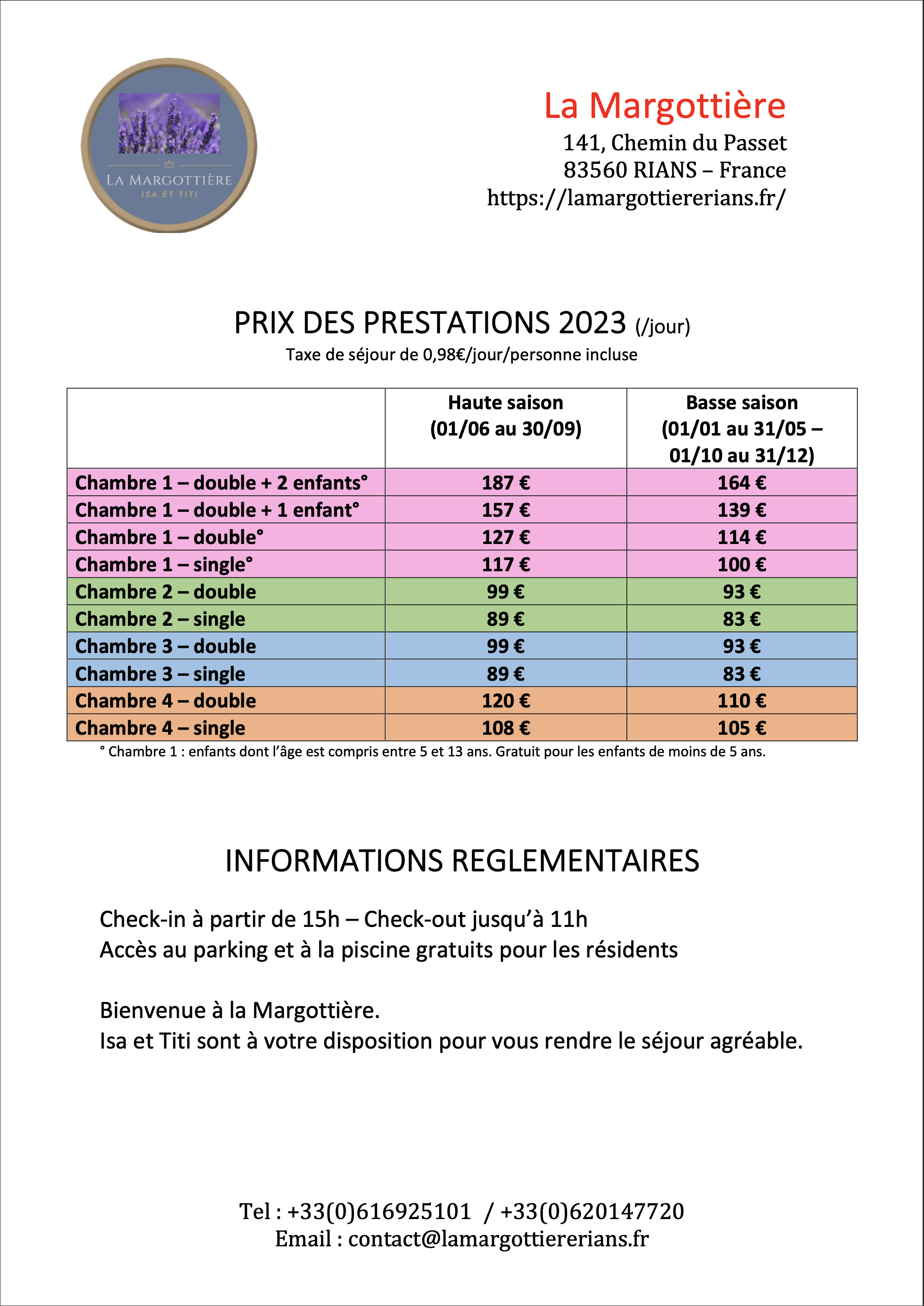 Pour tout renseignement ou pour réserver, téléphoner au +33(0)616925101, ou par mail, à l’adresse suivante : contact@lamargottiererians.fr